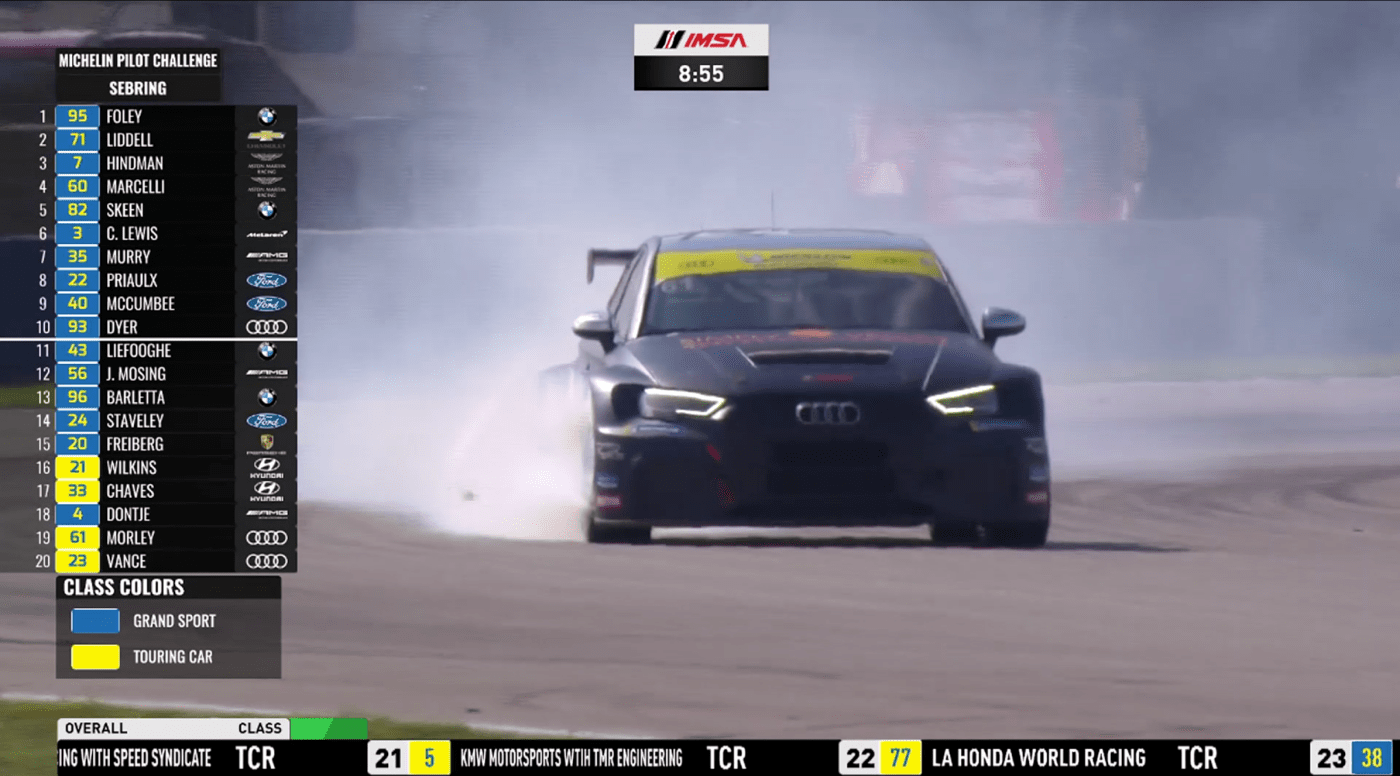 Morley was cautiously cruising home, taking it easy and avoiding curbs to make sure nothing would break on the car. But at Sebring, it’s impossible to avoid #thebumps and Morley’s right front shock finally had enough, snapping in two as he negotiated turn 7.